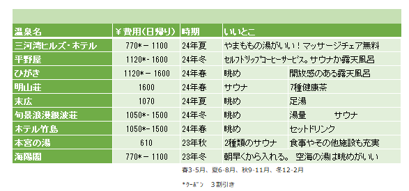 結果及び温泉一口メモ:Results & Notes