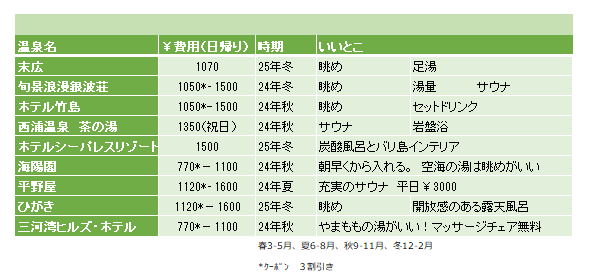 結果及び温泉一口メモ:Results & Notes